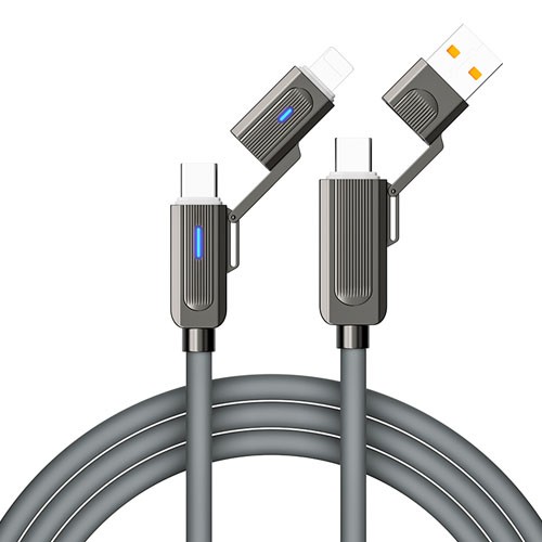 型号:L401-M1 功能:一线四用,二拖二数据线,支持100W超级快充 产品特点:四种模式,提速快充,锌合金头 任意转换,安全充电 数据线采用真硅胶材质,柔软亲肤,锌合金挂镀工艺插头, 高端大气,加粗线芯,真正的type-c接口4A快充